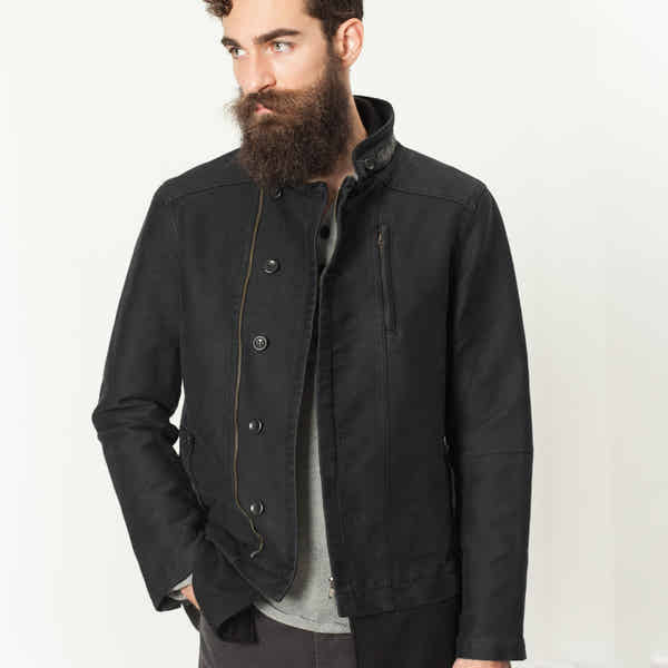 A ribbed-knit collar and a button-in liner at the waist trap your bodies heat in while a button placket is made further secure with a heavy-weight brass zipper at center front.  Leather detail at the stand collar and two hand warmer pockets that button closed. One zip pocket at the left breast. 100% Cotton. Hannes Roether. Color Black. Addis is wearing a size Small. Addis is 6’2”, Chest 38.5”, Waist 31”, Inseam 32”.
