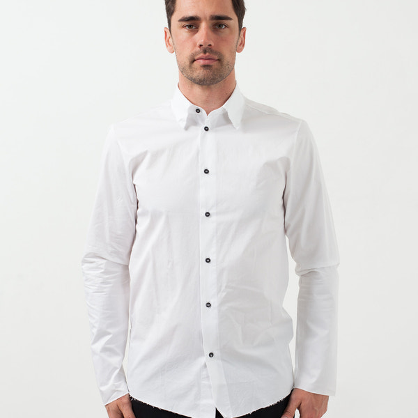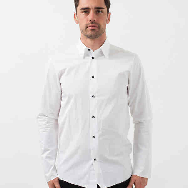 The Moun Button Up offers the perks of the classic top with raw finishes. Button placket closure at front. Hannes Roether. Color White. 100% Cotton. Made in the EU. Jacob is wearing a Small.