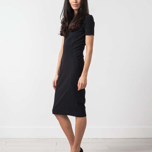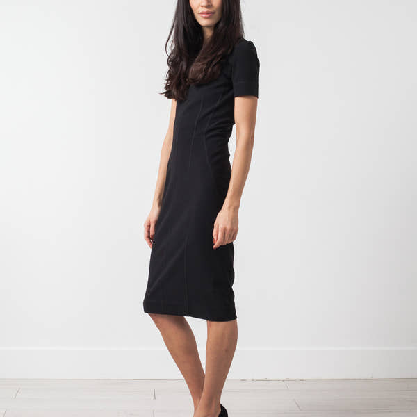 The Napilla offers a James Bond type of sexy. This body-con piece presents short sleeves, a flattering mid calf length, and seaming details on the princess seams. Elastic detail at V-cutout in back. By Malene Birger. Color Black.  92% Polyester, 8% Elastane, Trim 83% Polyamide, 17% Elastane. Ashley is wearing an X Small.