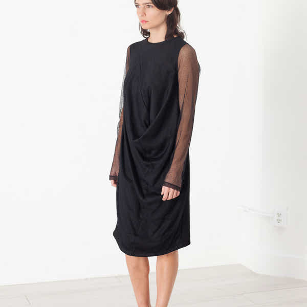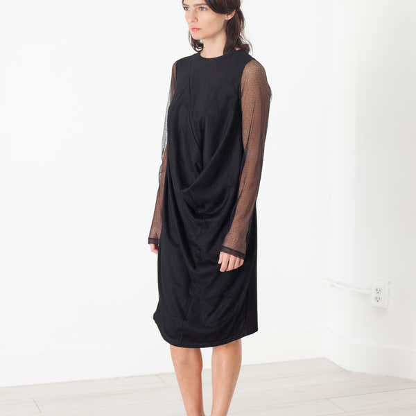 The Net Dress by Maria Calderera is eye catching and unique. With front draped accents and mesh sleeves, one is bound to stand out. Natural fitting silhouette through the knee. Color Black. 40% Polyester, 30% Polyamide, 26% Viscose, 4% Elastane. Made in Italy. Lana is wearing a Size 1.