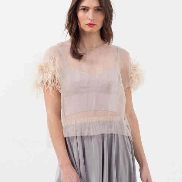 Louiza Babouryan offers a sweet cacophony of artistic vision for her Spring/Summer 2015 line. Dreamy pieces paired with flowing silhouettes invites to indulge on that delicious side. Composed of silk organza, this sheer Feather Top overlays wonderfully. Feather trim along sleeve. Color Sand. 100% Silk. Made in U.S.A. Lana is wearing an X-Small.