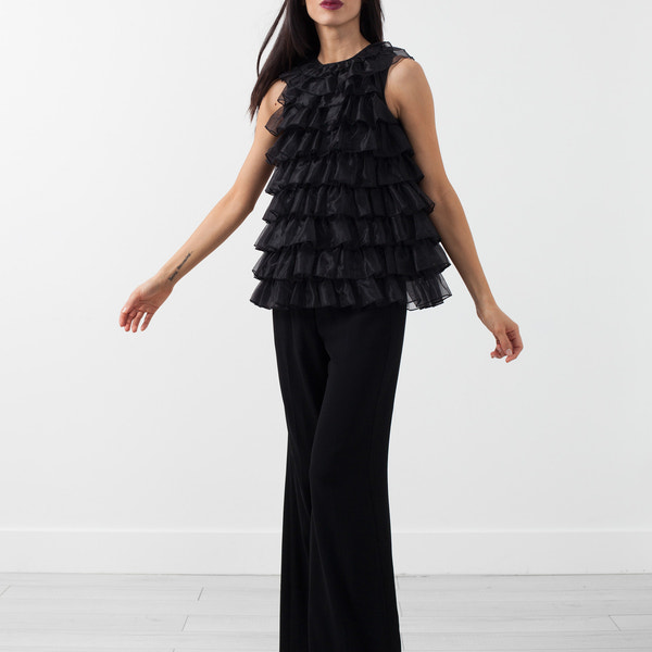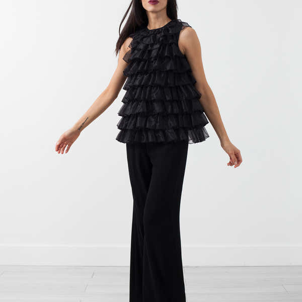 The Ruffle Top is the tasteful fun needed for springtime festivities. Sleeveless, crew neckline. Co. Color Black. Invisible zip closure at center back. Lined. 100% Silk, Lining 100% Acetate. Ashley is wearing an X-Small.