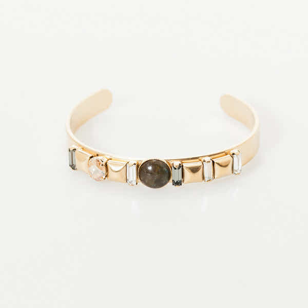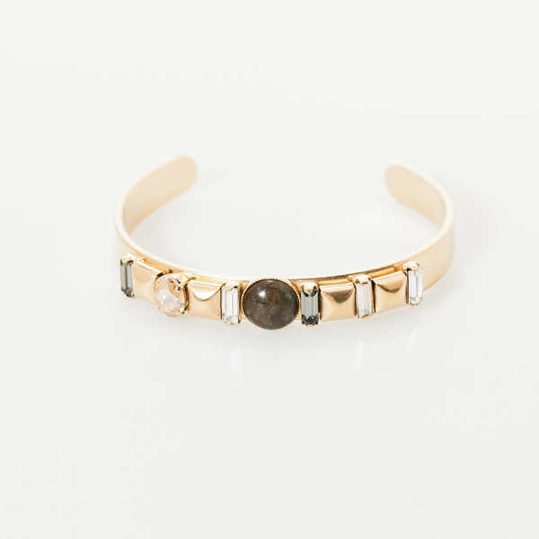 An adjustable gold toned cuff is crowned with an ornate display of Labrodite stones. 5 Octobre. Color Labrodite. Length 6 & 1/8", 3/8" Wide.