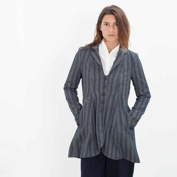 A stormy blue and gray striped coat has a rounded notched lapel, a five button closure and a slightly flared waist. One double welt pocket and a side seam pocket at the front. A single button storm flap and a back vent at hem. Lilith. Color Ink. 100% Virgin Wool, 100% Polyester. Flounce 75% Rayon & 25% Wool. Lining 67% Cotton. Lana is wearing an Extra-Small.