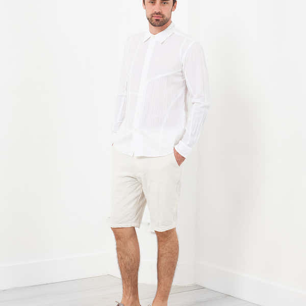 The Check Short from Sage de Cret offers an engaging texture with comfort stretch. Hook and eye closure with zip fly. Four exterior pockets. Lining. Color Off White. 56% Wool, 44% Polyester, Lining 100% Polyester. Made in Japan. Jacob is wearing a Medium.