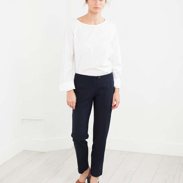 This slim fitting pant hits comfortably just above the ankle. Back darts lead to flattering fit. Straight-on front pockets. Single button fly air closure at front. Back pockets. Harvey Faircloth. Color Navy. 100% Wool. Pocket Lining, 100% Polyester. Made in U.S.A. Lana is wearing a size 2.