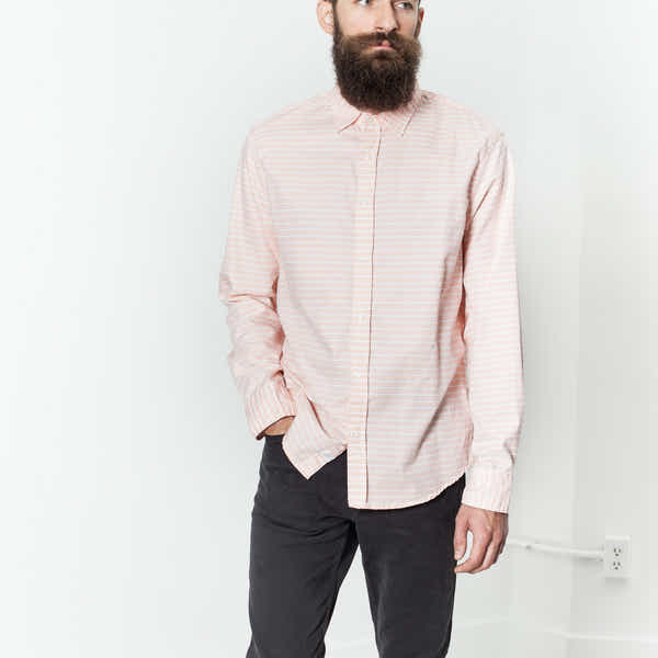 Almost as ubiquitous as the cotton T-shirt, but, made from the finest Italian cotton, Frank & Eileen shirts feature an intentional wrinkled effect adding even more personality to a brand that takes its name from an old-fashioned love story. A closet staple made more interesting by its wrinkled effect, features slim orange stripes, a breast pocket and center back seam. 100% Cotton. Made in U.S.A. Addis is wearing a size Large. Addis is 6’2”, Chest 38.5”, Waist 31”, Inseam 32”.