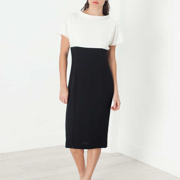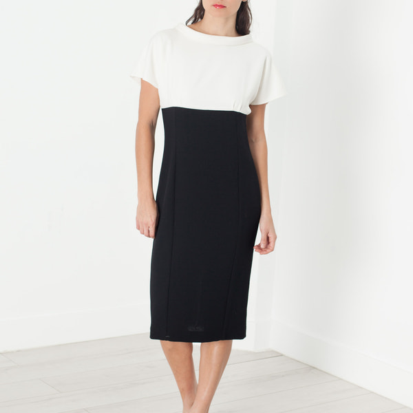 The Pearl Fastened Dress is organically graceful. Slim fitting throught the knee, this piece envokes an exquisite silhouette. Beautiful seaming, dolman sleeves, and slight opening with pearl button closure at back neck. Graceful self-fabric collar. Amelia Toro. Color Cream/Black. 100% Wool, 80% Wool, 20% Polyester. Made in Columbia. Lana is wearing a Size 4.