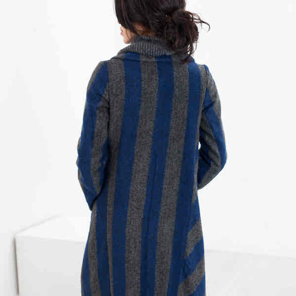 A heavy wool coat makes a graphic statement with multi-directional electric blue stripes. Non-functional buttons line an off center asymmetrical zipper. Bias stripes at the side add movement and flounce. Lilith. Color Silver/Blue. 26% Virgin Wool, 42% Acrylic, 21% Polyester. Ashley is wearing an Extra-Small.