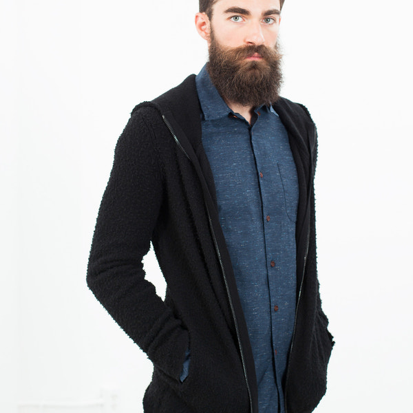A long and comfortable hooded knit sweater with a uniform pilling that makes this cashmere and wool blend less precious. Don't be afraid to wear this one to death. Avant Toi. Colors Black. 70% Merino Wool, 30% Cashmere. Made in Italy.