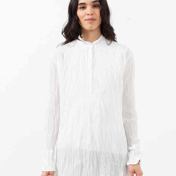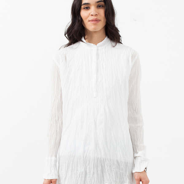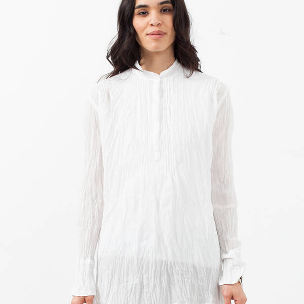 The Pin Tuck Blouse is a traveler's dream staple for its weight and classism. Half button placket at front. Mandarin collar. Hazel Brown. Color White. 100% Cotton. Made in U.S.A. Ashley is wearing a Size 1.