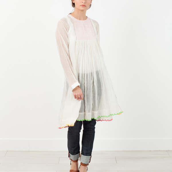 This dress provides just enough color to hint warmer temperatures while remaining universally seasonless. Intricate gathers and paneling throughout adds to the piece's eclecticism. Completely handmade, stitched, and embroidered. Long sleeves with silk cuffs,and a natural, loose silhouette. Single button closure at center back. Pero. Color White. 50% Cotton, 50% Silk. Made in India. Lana is wearing a size 38.
