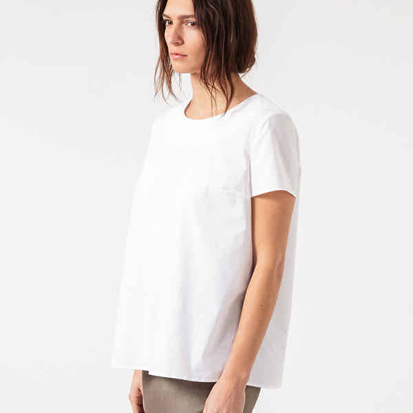 Single back pleat creates a cape-like silhouette which flatters and fits. Lightweight material is perfect for hot weather. Subtle front side darts. Scoop neckline. Side slits at hem. Ter et Bantine. Color White. 100% Cotton. Made in Italy. Lana is wearing an Italian 40.