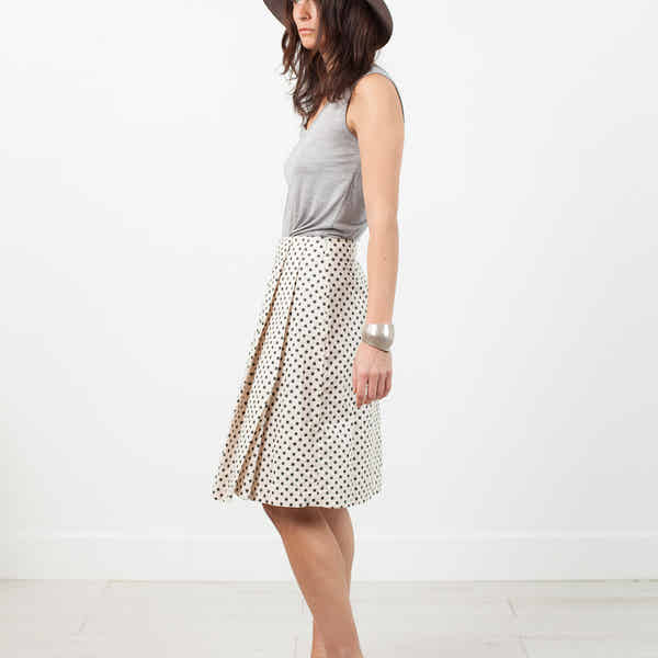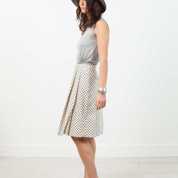 Dot love. The Pleated Skirt offers the flattering A-line cut with delighting pleats at side. Back darts accentuate desirable fit. Hits knee-length. Pip-Squeak Chapeau. Color Glitter Dots. 100% Cotton. Made in U.S.A. Lana is wearing a size Small. Lana is 5'7, hips 36.5", waist 25", bust 34.5".