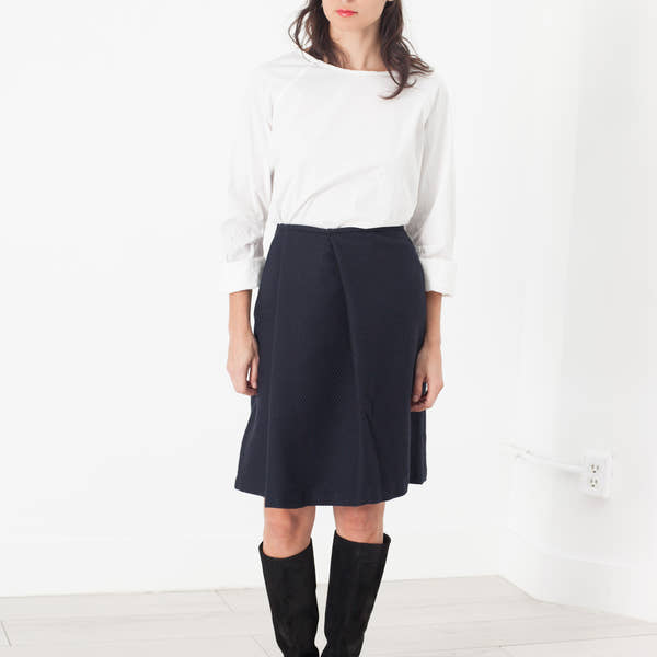 Flared, beautifully woven knee length skirt by Pip-Squeak Chapeau invites second glances. Accent pleats creates desired fullness through skirt. Invisible side zip. Color Navy. 100% Wool. Made in U.S.A. Lana is wearing a Small.