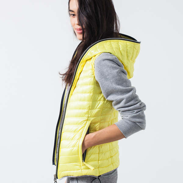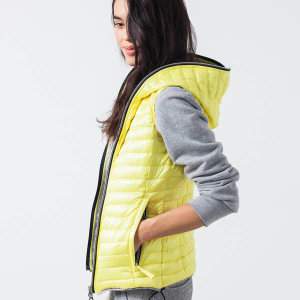 The Primula Vest makes a perfect accessory for spring weather. Sleeveless, adjustable waist drawstring, and various interior and exterior pockets. Front zip closure with hood. Fully lined. Duvetica. Color Yellow. 100% Polyamide, 100% Cotton, Goose New Down. Made in Bulgaria. Ashley is wearing an Italian 40.