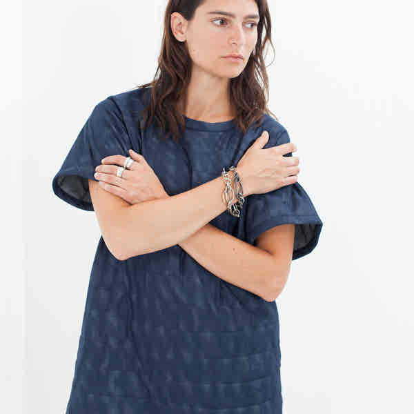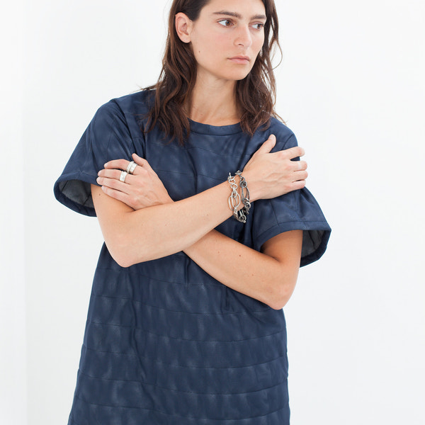 Our stylist's favorite, the Quilted Mesh Mini Dress looks great belted or hanging straight down from the shoulder. Maria Calderara. Color Navy. 100% Polyamide with 100% Polyester Padding. Lana is wearing a size 1.