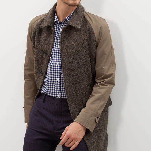Classic boiled wool with weather proof nylon canvas. Strapped cuffs and raglan sleeves contrast a woolen front welt and patch pockets. Mauro Grifoni. Color Olive. Made in Italy.