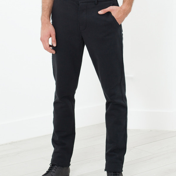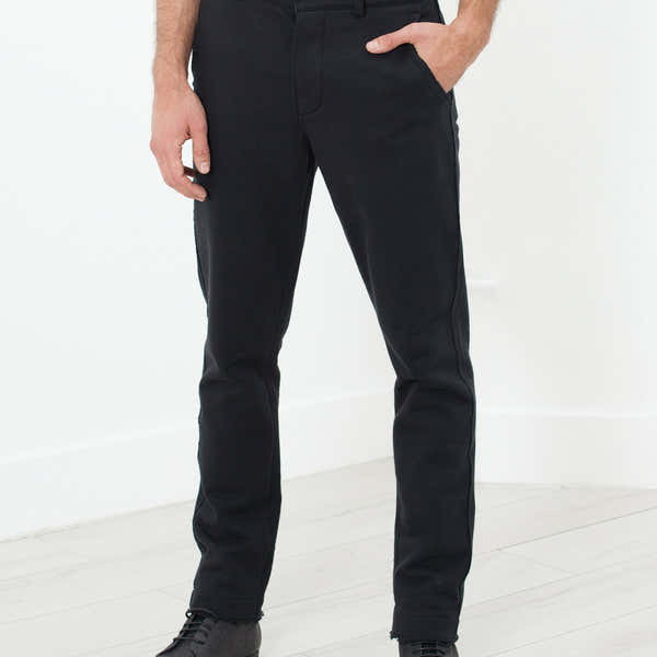 A slim pant leg in a thick and comfortable cotton terry. Regular jean styling with a button fly and belt loops, back welt pockets and two front angle pockets. A lovely travel companion for long flights or an easy day about town. Hannes Roether. Color Black. 100% Cotton. Addis is wearing a size Small. Addis is 6’2”, Chest 38.5”, Waist 31”, Inseam 32”.