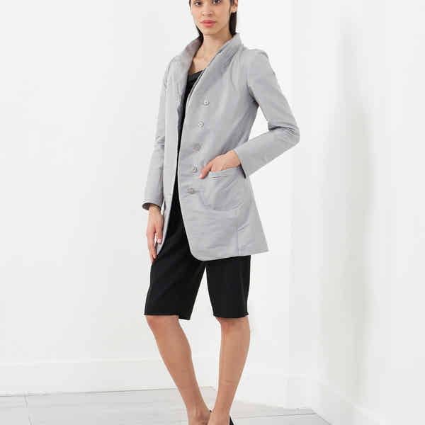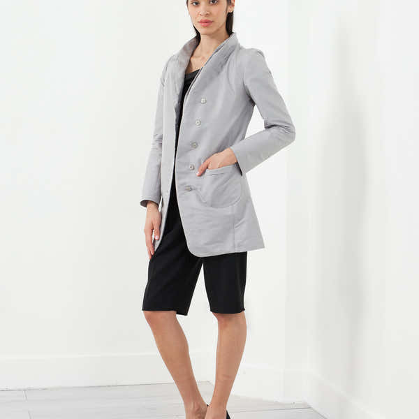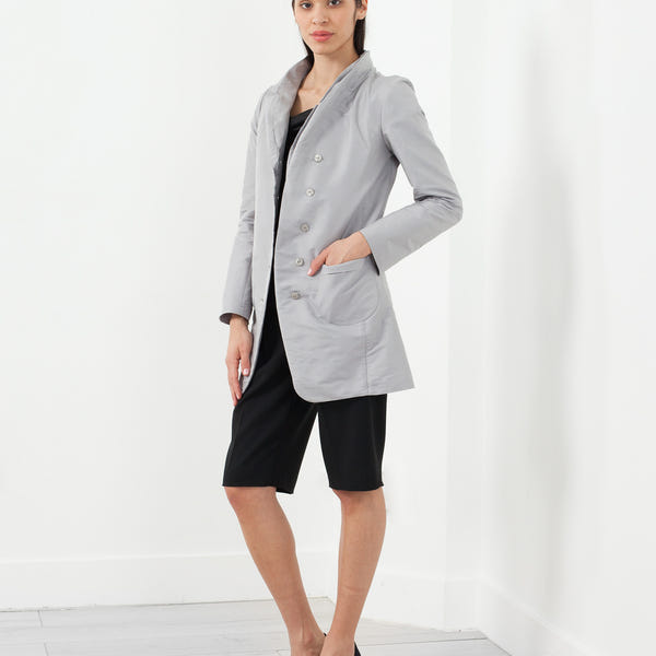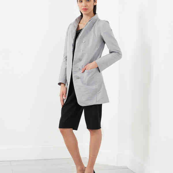 Elegance made playful. The Reasonable Jacket offers uniqueness of texture paired with excellence in tailoring. Single side angled pocket, exterior pocket at front. Button placket closure at front. Double lapel. Lilith. Color Grey. 100% Polyester. Made in Tunisia. Ashley is wearing an X Small.