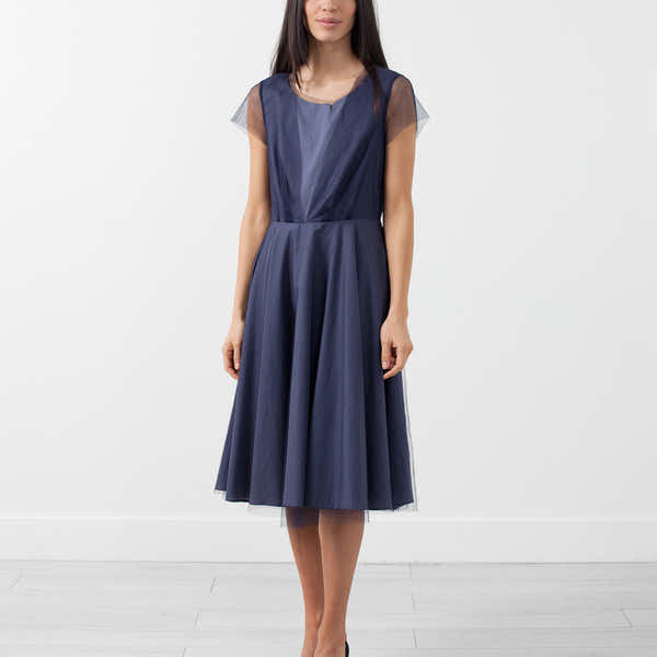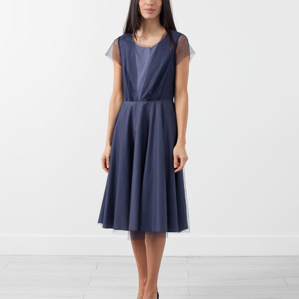 The Relax Dress tea-length with a full skirt. Reinvented v-neckline. Capped mesh sleeves. Lilith. Color Ondee. 100% Cotton, Mesh Overlay 100% Polyester. Ashley is wearing an X-Small.
