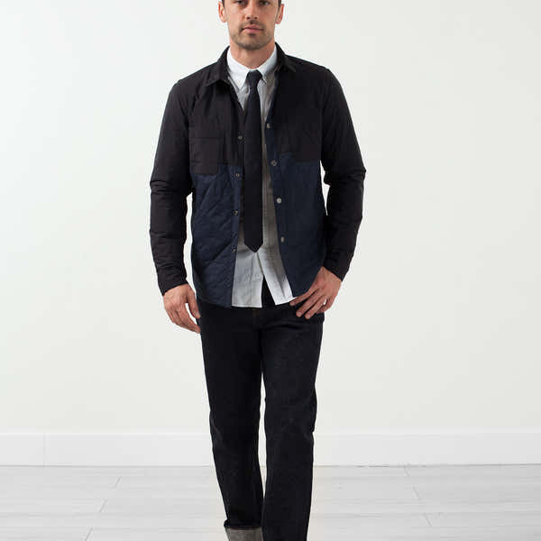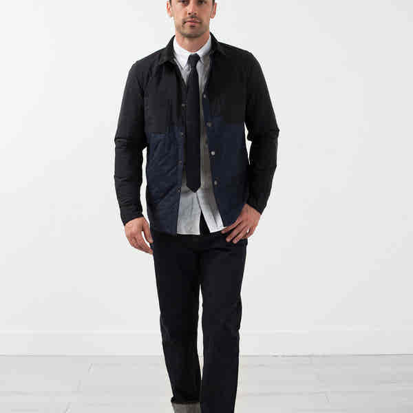 The Quilted Coat makes an excellent, lightweight layering piece. Double breast pockets on exterior and interior. Snap button closure at front. Reversible. Fully lined. Esemplare. Color Black/Navy. 85% Nylon, 15% Elastane, 2nd Shell 58% Cotton, 30% Nylon, 12% Polyurethane, 3rd Shell 100% Polyester, Padding 100% Polyester. Made in Italy. Jacob is wearing a Size 50.