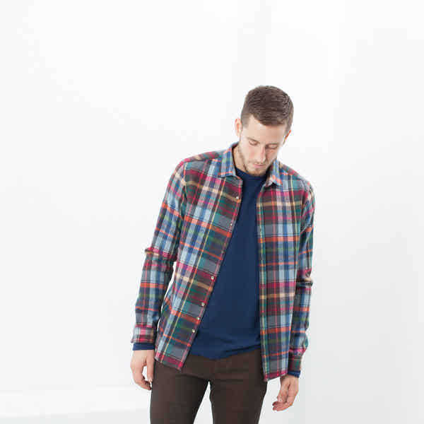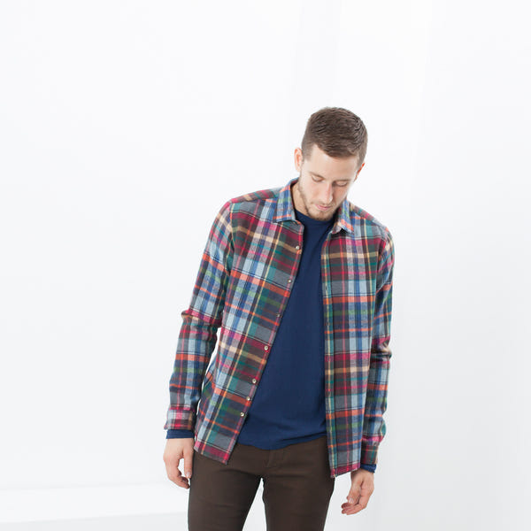 A multicolored plaid button up is crafted from a blend of soft wool and cotton and features distinctive gold metal buttons. A back yoke completes the shirt. Aglini. Color Plaid Multi. 55% Wool, 45% Cotton. Made in Italy. Matt is wearing a size 42. Matt is 6’2”, Chest 38”, Waist 31”, Inseam 34.5”.