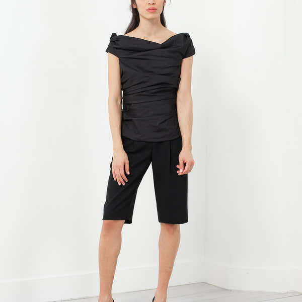 The Riot Top is a romantic piece of gathering and placement. Invisible zip closure at side. Lilith. Color Black. 100% Polyester. Made in Tunisia. Ashley is wearing an X Small.
