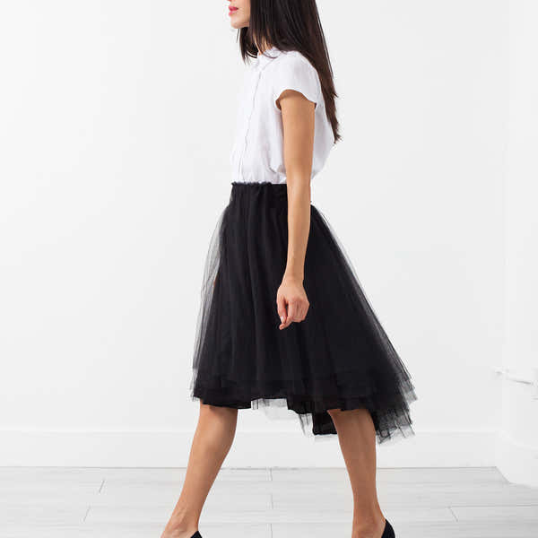 Tulle overlay with layers upon layers of dancing dreams. Invisible zip closure at left side. Lilith. Color Black. 100% Cotton, Tulle 100% Polyester. Ashley is wearing an X-Small.