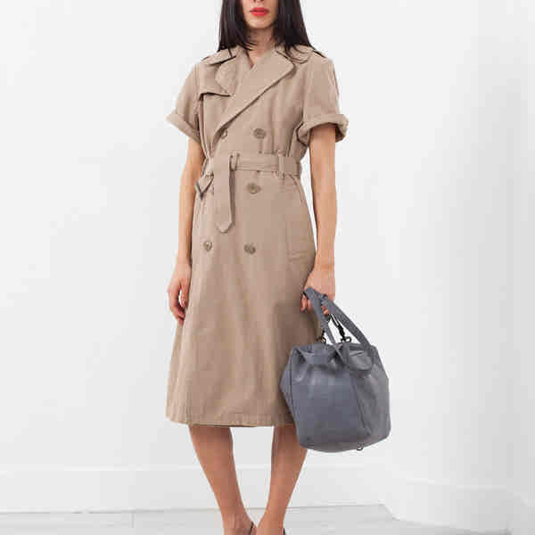The Trenchcoat presents a feminine army casual as a overcoat or statement dress. Double button closure at front. Adjustable belt at waistband. Side angled pockets at front. NLST. Color Khaki. 100% Cotton. Ashley is wearing an X-Small.
