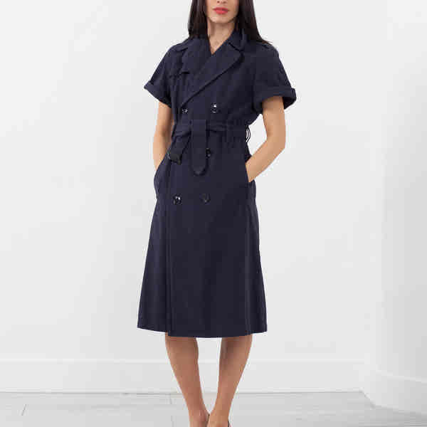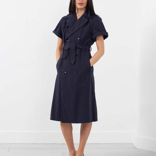 The Trenchcoat presents a feminine army casual as a overcoat or statement dress. Double button closure at front. Adjustable belt at waistband. Side angled pockets at front. NLST. Color Navy. 100% Cotton. Ashley is wearing an X-Small.