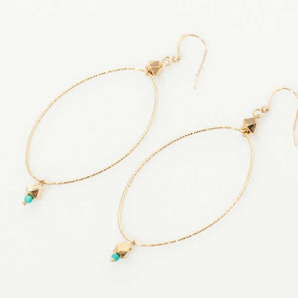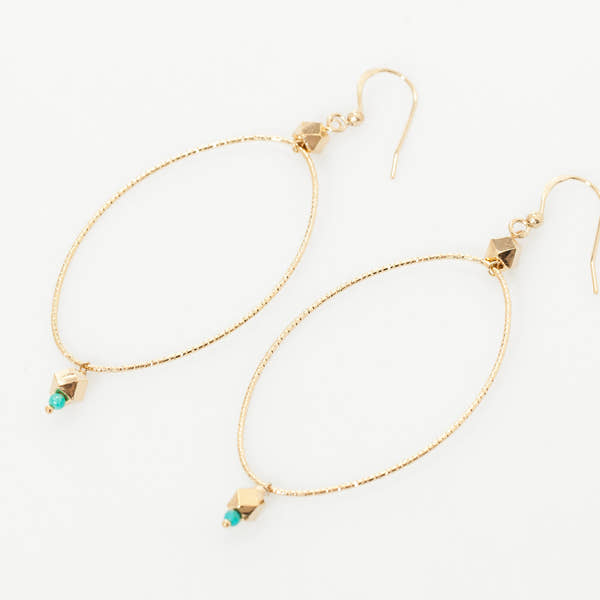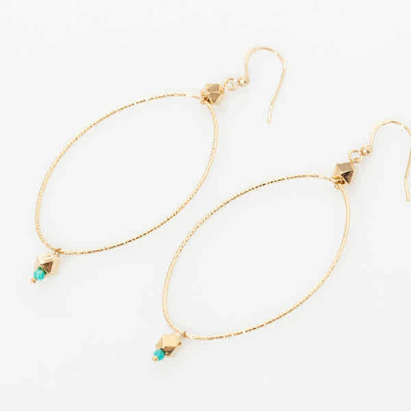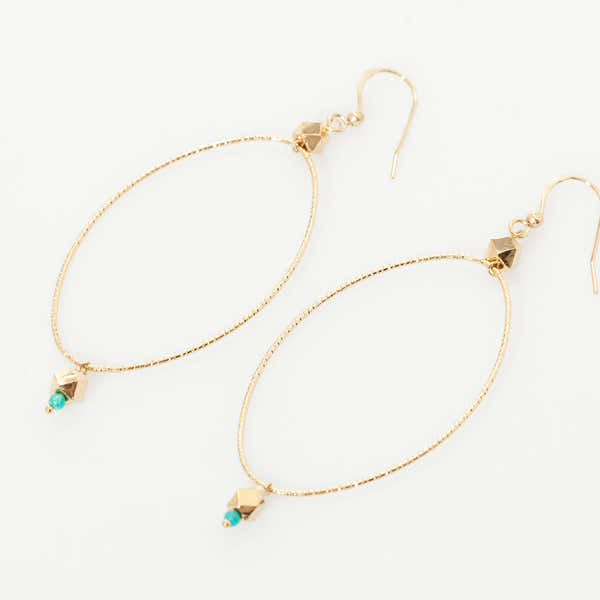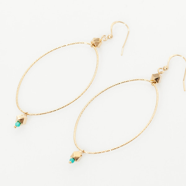 Oblong circles have convex curves and a sleek profile. Accented with small dangling gold beads. 5 Octobre. Color Gold Brass. Length 2.25", 1 1/8" Wide.