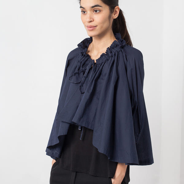 The Cabin is a peasant-like blouse of desiring volume. Ruffled and gathered, this top acts as a light overlay to statement jacket. Adjustable drawstring tie at neckline. Gathered sleeves. Yoshi Kondo. Color Navy. 73% Cotton, 27% Linen. Ashley is wearing a Small.