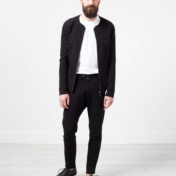 The Rumor Jacket speaks to the raw urbanity of all things. Unfinished hemlines, side paneling, and semi-raglan sleeves. Interior breast pocket. Front waist pockets. Full contrast zip at center front. Hannes Roether. Color Black. 100% Cotton, 95% Cotton, 5% Elastane. Addis is wearing a Small.