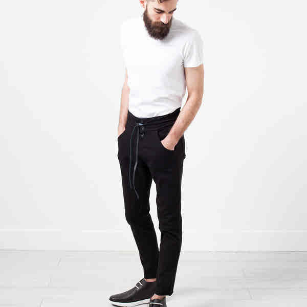The Ruven Pant offers dimension to the classic black pant. Dynamically structured and instructionally sound, the secret to success is all in the details. Hannes Roether. Color Black. 100% Cotton, 95% Cotton, 5% Elastane. Addis is wearing an X Small.