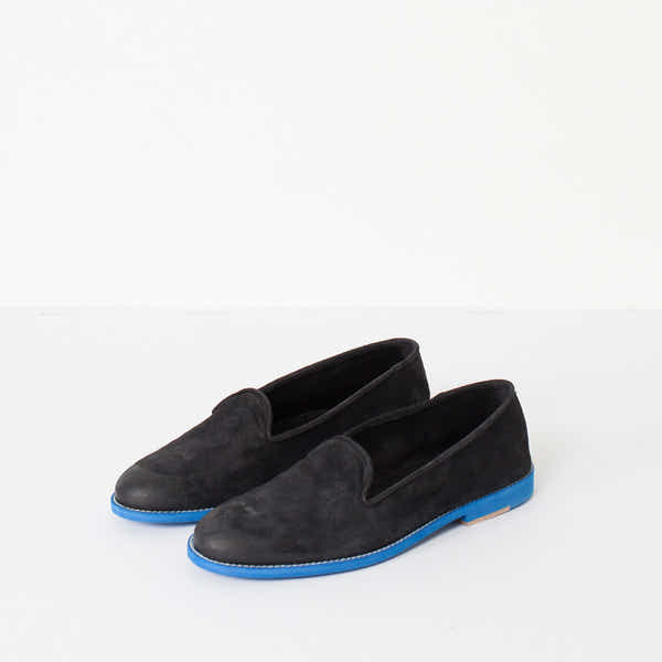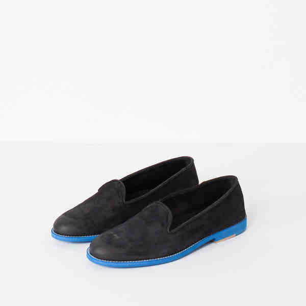 Suede loafer with a neon sole. An individualized twist on an age-old classic. Verba. Color Black/Blue. 100% Suede Leather, Waterproof Synthetic Sole. Made in Italy.