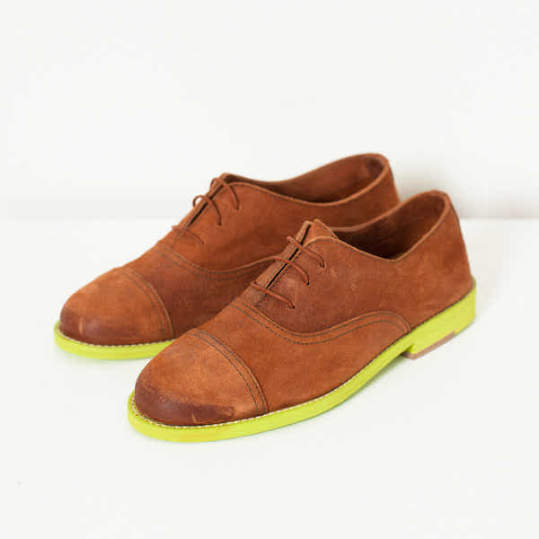 Suede oxford with a neon sole. An individualized twist on an age-old classic. Verba. Color Natural/Lime. 100% Suede Leather, Waterproof Synthetic Sole. Made in Italy.