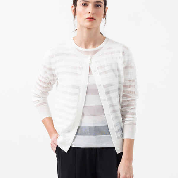 The Sailor embraces the Breton stripe and a little bit of sparkle. Button placket closure at center front with covered panel. Nicholson & Nicholson. Color White. 55% Cotton, 25% Nylon, 20% Polyester. Made in Japan. Lana is wearing a French 38.