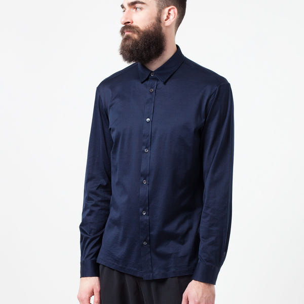 The coolness of navy is epitomized in the Scotland Shirt from Mauro Grifoni. Extreme comfort to wearer communications intention of design and quality of fibers. Offers a fantastic fit with slight stretch. Color Navy. 100% Cotton. Made in Italy. Addis is wearing an Italian 42.