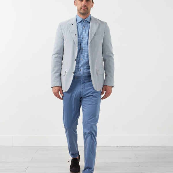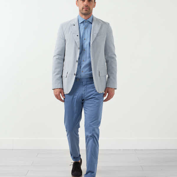 The Five Button Blazer is elegant, yet casual. Industrially strong fabrics combined in a classic silhouette makes a refined look. Button placket closure at center front. Three exterior pockets at front, two interior pockets. Lardini. Color Blue/White. 100% Cotton, Jacket Lining 100% Cotton, 60% Acetate, 40% Cotton. Made in Italy. Jacob is wearing an Italian 50.