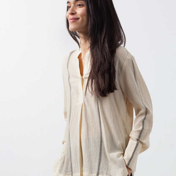 Bohemian beauty, the Seva Top presents a tunic silhouette perfect for beachwear. V-neckline. Single button closure at cuffs. By Malene Birger. Color Beige. 100% Cotton, 100% Silk Trim. Ashley is wearing a Size 32.