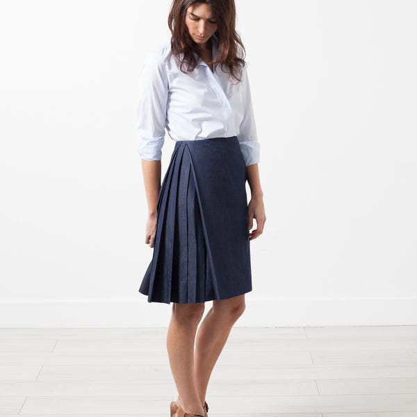 Gianfranco Scotti designs for the women of the future. The trend setters. The movers of society. Impeccable construction paired with innovative design makes his pieces a means of expression. The Side Pleat Skirt offers uniformity with an undeniable chicness. Invisible zip closure at left side. Color Jean. Lined. 100% Cotton. Made in Italy. Lana is wearing a French 36.