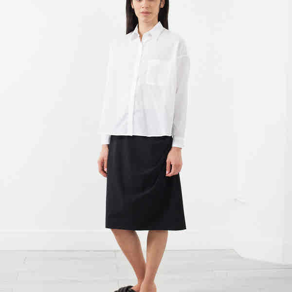 The Ruche Skirt offers an easy go-to for your busiest times. Pencil silhouette, knee length. Invisible zip closure at side. Hovman. Color Black. 80% Polyamide, 20% Elastane. Ashley is wearing a German 34.