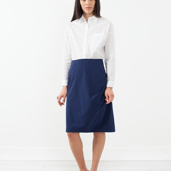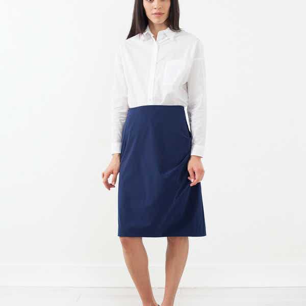 The Ruche Skirt offers an easy go-to for your busiest times. Pencil silhouette, knee length. Invisible zip closure at side. Hovman. Color Blue. 80% Polyamide, 20% Elastane. Ashley is wearing a German 34.