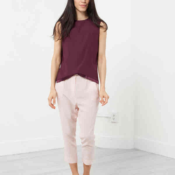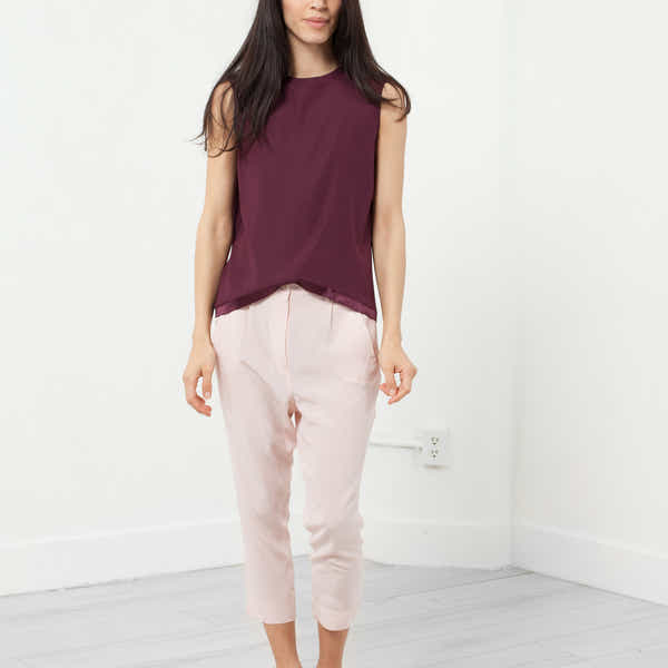 The Silk Pant is a slim pant with slight drop. Single button with zip fly closure at front. Side angled pockets with coin pocket at front, one exterior pocket at back. Sibel Saral. Color Pink. 100% Silk. Made in Turkey. Ashley is wearing an X-Small.