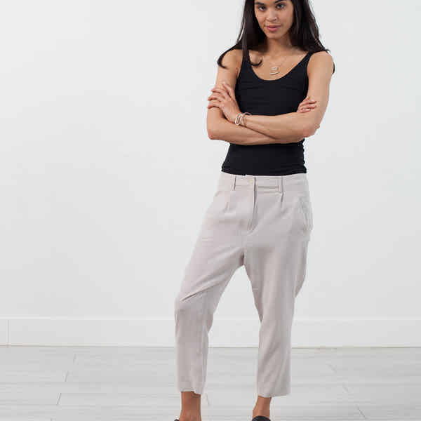 The Silk Pant is a slim pant with slight drop. Single button with zip fly closure at front. Side angled pockets with coin pocket at front, one exterior pocket at back. Sibel Saral. Color Stone. 100% Silk. Made in Turkey. Ashley is wearing a Small.