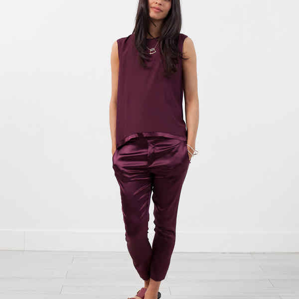 The Silk Pant is a slim pant with slight drop. Elastic waistband for ease. Side angled pockets with coin pocket at front, one exterior pocket at back. Sibel Saral. Color Wine. 94% Silk, 6% Elastane. Made in Turkey. Ashley is wearing an X-Small.
