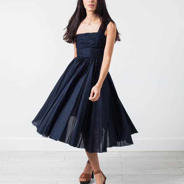 Go ahead, take her for a spin. The One Shoulder Dress by Amelia Toro invites twirls and sighs. Full circle skirt with an intricately pleated bodice. Invisible zip closure at center back. Color Navy. 100% Cotton. Made in Columbia. Ashley is wearing a Size 2.