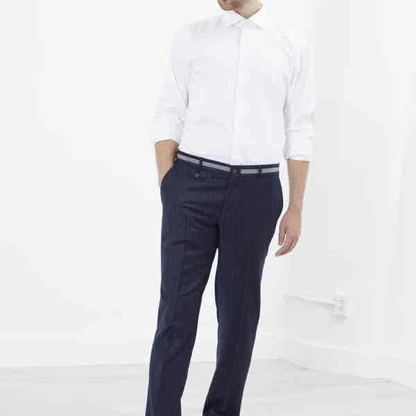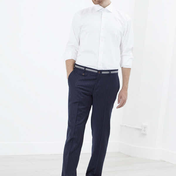 Dapper wool pinstripes define the Sinclair trouser by Circle of Gentlemen. The front features a distinctive contrasting wool waistband with angled pockets and one small coin pocket. Finished with two double welt pockets with button closure and an unfinished overlocked hem for easy tailoring. Color Navy Stripe. 100% Virgin Wool. Spencer is wearing an Italian 50.