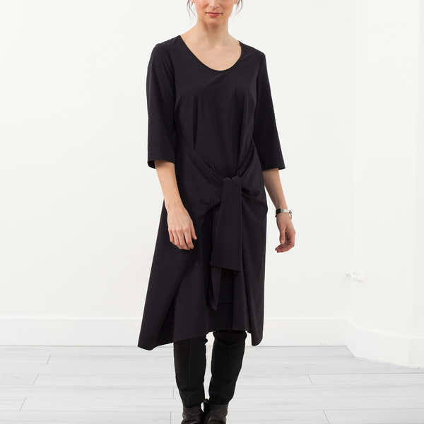 This reinterpretation of closet staples with water resistant features demonstrates Hovman's ability to offer functional classics for everyday wear. The Sleeve Dress provides uniqueness in texture and silhouette. Scooped neckline. 3/4 inch sleeves. Sleeve tie at waist. Color Black. 80% Polyester, 20% Elastane. Lana is wearing a German 34.